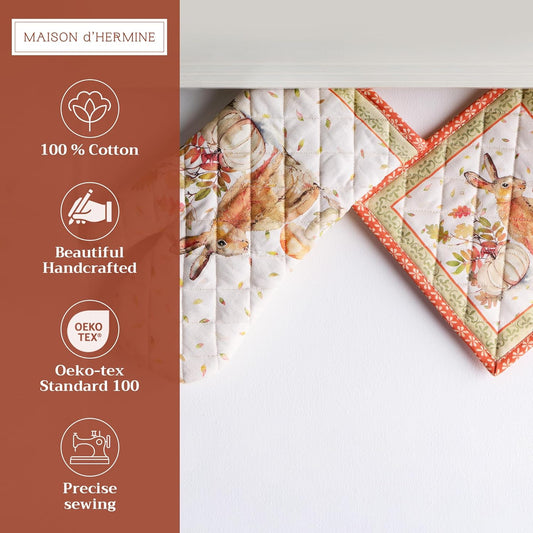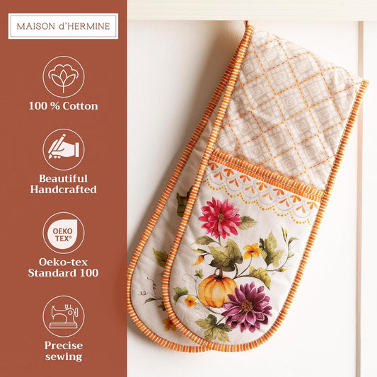 Maison d' Hermine Double Oven Mitts 100% Cotton 7"x35" Double Oven Mitt Heat Resistant BBQ Cooking Gloves with Loop, Baking, Grilling, Home, Kitchen, Handling Hot Pans (Pumpkin Garden - Cloudy Cream)