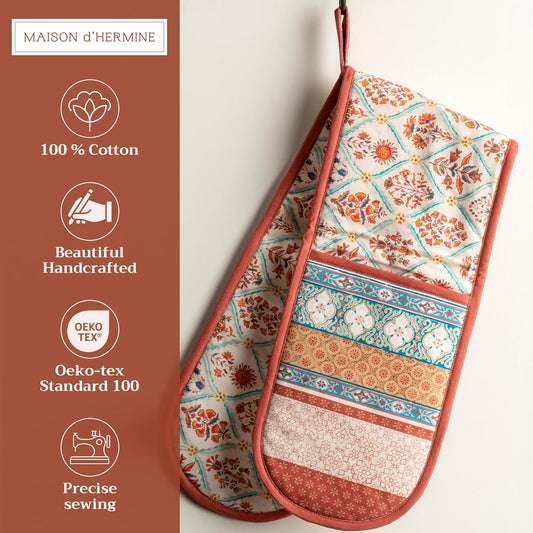 Maison d' Hermine Double Oven Mitts 100% Cotton 7"x35" Double Oven Mitt Heat Resistant BBQ Cooking Gloves with Loop, Baking, Grilling, Home, Kitchen, Handling Hot Pans (Romane)