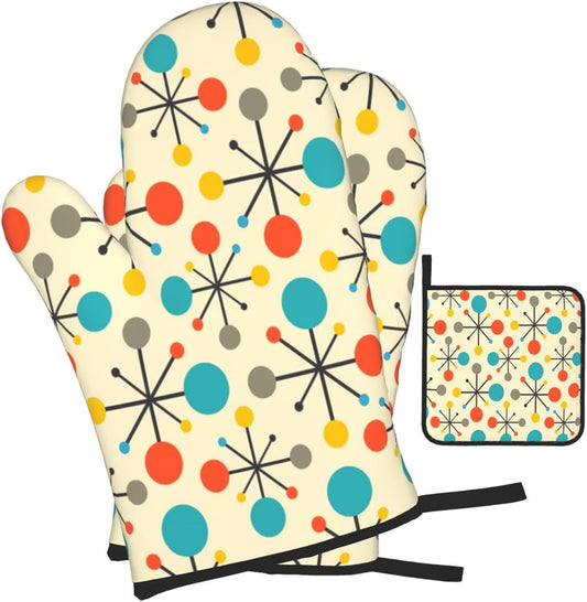 Mid Century Fifties Modern Atomic Retro Oven Mitts and Pot Holders Sets of 3, Yellow Kitchen Decor or Accessories, Heat Resistant Hot Pads Oven Gloves,Cooking Grilling Baking Gifts for Women