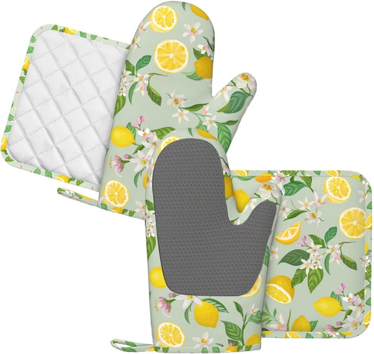 Lemon Oven Mitts Pot Holders Set Silicone Lemon Paper Yellow Citrus Fruit Lemons Kitchen Oven Mitts Heat Resistant Potholders Non-Slip 4pcs Hot Pads and Oven Gloves Sets for Baking,Grilling