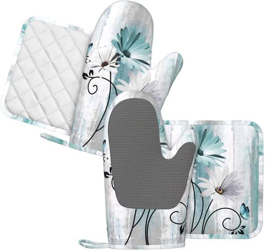 Teal Daisy Oven Mitts Pot Holders Set Silicone Heat Resistant Farm Teal Daisy Floral Flowers and Butterfly Oven Mitts and Hot Pads Potholders Non-Slip Oven Gloves for BBQ