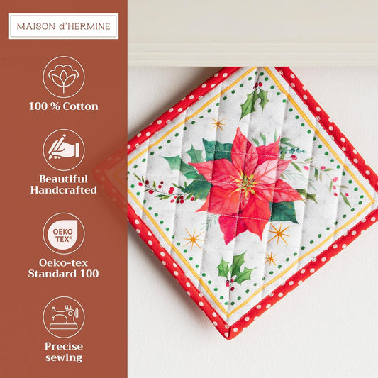 Maison d' Hermine Pot Holders 100% Cotton Heat Resistant Potholders 8" x 8" Hot Pads with Loop BBQ, Cooking, Baking, Grilling, Kitchen, Handling Hot Pans (Pack of 1, Poinsettia Christmas)