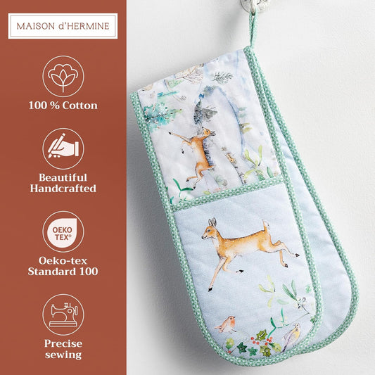 Maison d' Hermine Double Oven Mitt 100% Cotton Heat Resistant Cooking Gloves with Loop, Baking Barbeque, Handling Hot Pan, Fairytale Forest - Thanksgiving/Christmas (7 Inch x 35 Inch)