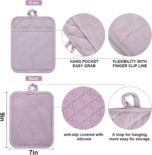 Pot Holders Yarn-Dyed Set of 3 Non Slip Silicone Kitchen Lines Heat Resistant 500℉ Kitchen Gloves BBQ Cooking Baking Cooking Barbecue Microwave Machine Washable (Purple Pot Holders)