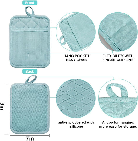 Pot Holders Yarn-Dyed Set of 3 Non Slip Silicone Kitchen Lines Heat Resistant 500℉ Kitchen Gloves BBQ Cooking Baking Cooking Barbecue Microwave Machine Washable (Light Blue Potholders)