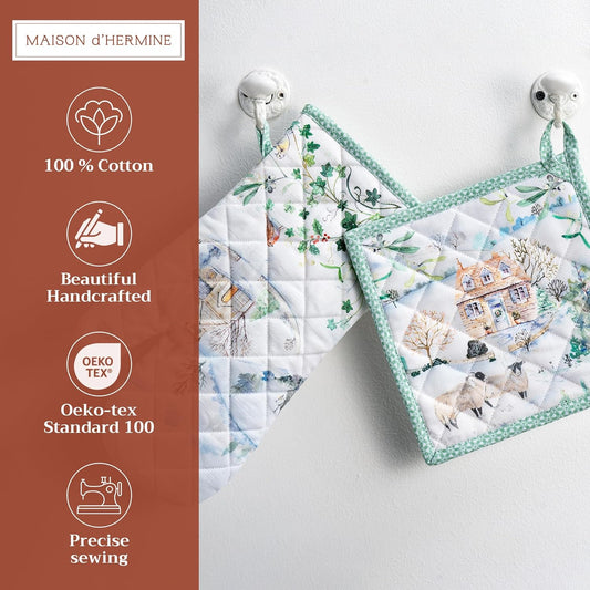 Maison d' Hermine 100% Cotton Oven Mitt & Pot Holder Set (7.5"x13" & 8"x8") Heat Resistant BBQ Cooking Gloves with Loop, Baking, Grilling, Kitchen, Handling Hot Pans (Winter Mornings)