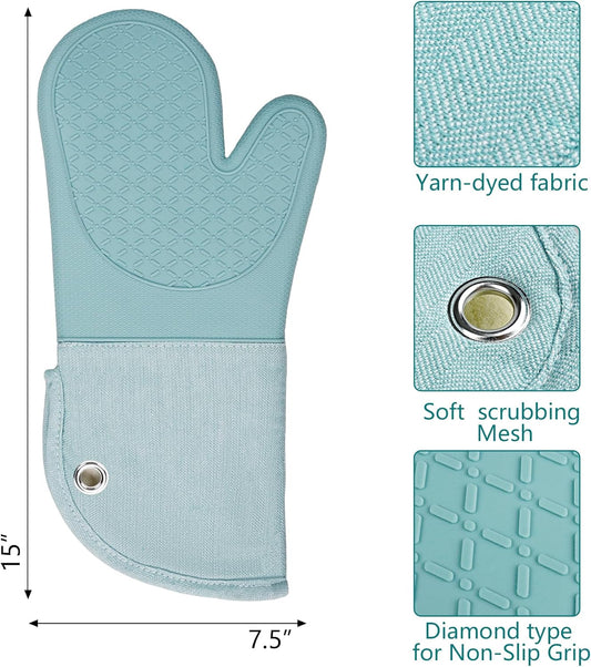 Professional Microwave Silicone Oven Mitts one Pair, Kitchen Mitten Set for Heat Resistant with 500 Degrees, Kitchen Gloves Pot Holder for BBQ Cooking Baking (Light Blue)