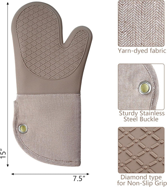 Professional Microwave Silicone Oven Mitts one Pair, Kitchen Mitten Set for Heat Resistant with 500 Degrees, Kitchen Gloves Pot Holder for BBQ Cooking Baking (Khaki)