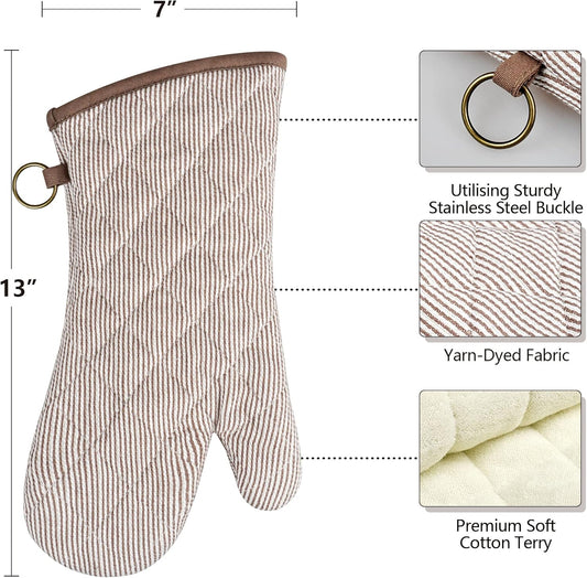 1 Pair Yarn Dyed Oven Mitts 100% Cotton Heat Resistant 470 Degree Gloves Men Women Cooking Baking Barbecue BBQ Microwave Crafting Machine Washable Pot Holders Mittens (Khaki)