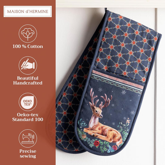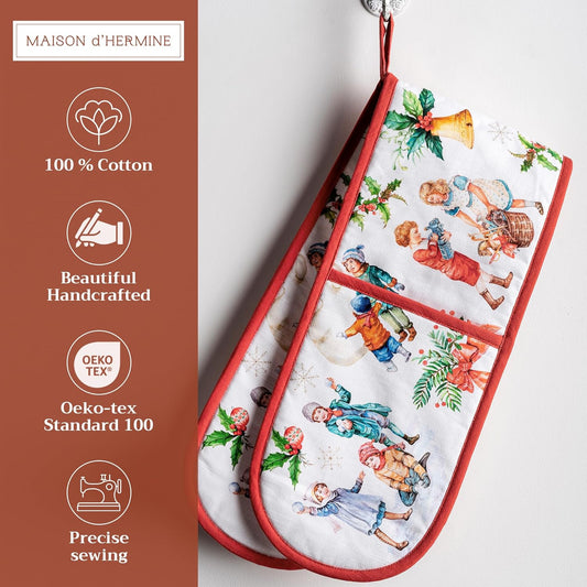 Maison d' Hermine Double Oven Mitts 100% Cotton 7"x35" Double Oven Mitt Heat Resistant BBQ Cooking Gloves with Loop, Baking, Grilling, Home, Kitchen, Handling Hot Pans (Hygge Christmas)