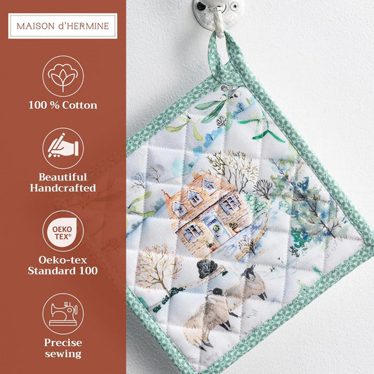 Maison d' Hermine Pot Holders 100% Cotton Heat Resistant Potholders 8" x 8" Hot Pads with Loop BBQ, Cooking, Baking, Grilling, Kitchen, Handling Hot Pans (Pack of 1, Snowy World)