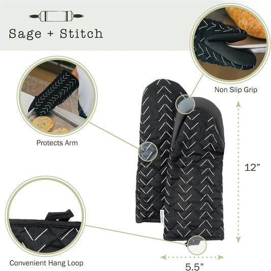Heat Resistant Designer Kitchen Oven Mitts with Neoprene Non-Slip Grips and Hanging Loops | Set of 2 100% Cotton Long Sleeve Kitchen Oven Mitts | 5.5" x 12" | Black