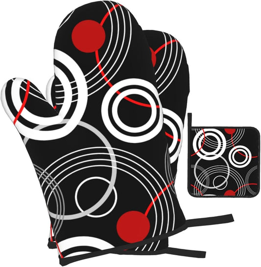 Modern Black Red Retro Oven Mitts and Pot Holders Sets of 3 Abstract Modern Hot Pads Heat Resistant Non Slip Washable for Cooking Grilling Baking BBQ Kitchen Decor