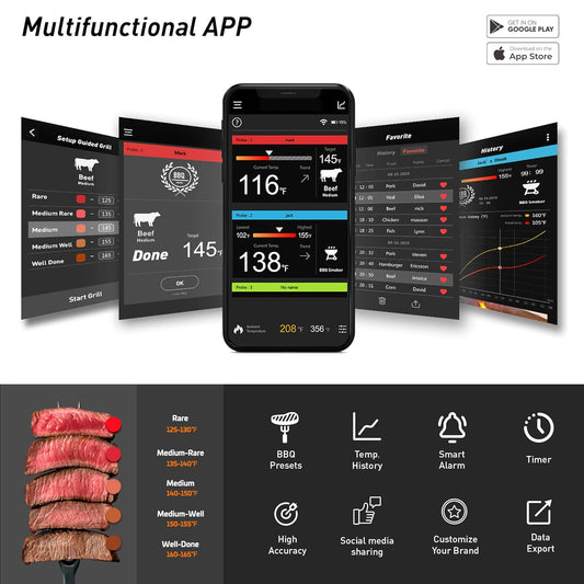 Smart Wireless Meat Thermometer for Grilling and Smoking – Bluetooth 5.2, 150m Range, IP65 Waterproof Probe – Rechargeable USB-C BBQ Thermometer for Smoker, Oven, Rotisserie