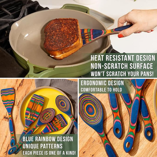 5pc Wood Cooking Utensils Set - Wooden Spoons for Cooking – Pakka Wood Utensils for Cooking and Serving – Comfortable Grip and Non Stick (Blue Rainbow)
