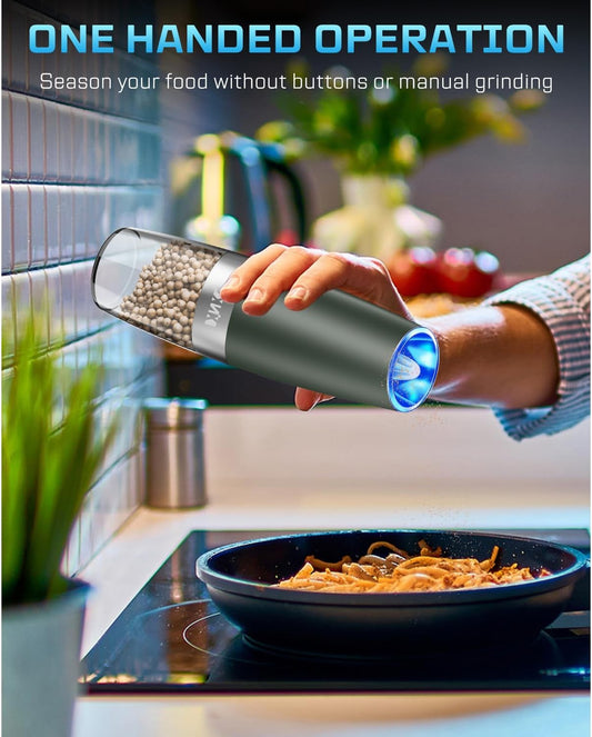 XinXu Gravity Automatic Electric Pepper and Salt Grinder, Auto Salt or Pepper Mill Shaker Stainless Steel,Blue LED Light,One Hand Operated, LightGrey