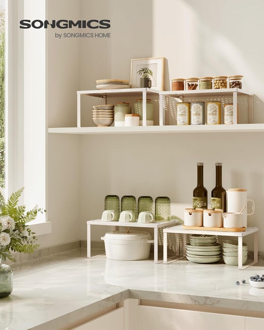 SONGMICS Spice Racks, Set of 2 Metal Cabinet Shelf Organizers, Countertop Organizers, Shelf Risers, Stackable, Expandable, White UKCS005W01