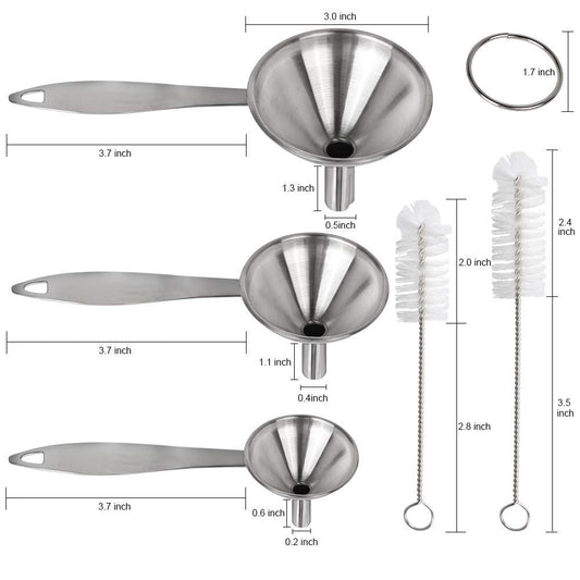 Kitchen Funnels for Filling Bottles, YGDZ 3pcs Small/Medium/Large Food Grade Stainless Steel Metal Kitchen Funnels Set for Essential Oil Spices Liquid, 2pcs Cleaning Brushes