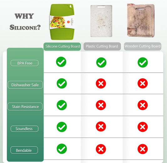 Silicone Thick Cutting Boards Mats Set of 3 Foldable & Flexible Design Juice Grooves Easy Grip Handle Dishwasher Safe for Kitchen,BPA free Silicone Cutting Board-Green