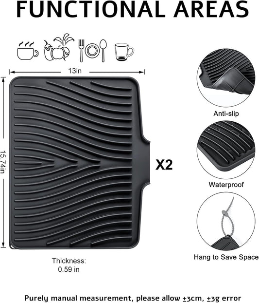 Dish Drying Mat, Stone Drying Mat for Kitchen Counter with Built-in Drain, Non-Slip Drying Matt Kitchen Counter, Heat Resistant Silicone Drying Mat, 2 Pcs(15.8"X 13", Black)