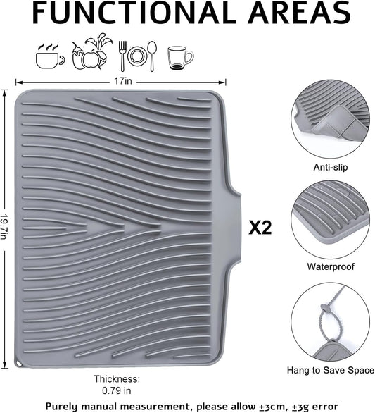 Dish Drying Mat, Stone Drying Mat for Kitchen Counter with Built-in Drain, Non-Slip Drying Matt Kitchen Counter, Heat Resistant Silicone Drying Mat, Dish Drying Pad, 2 Pcs(Grey 19.7" x 17")