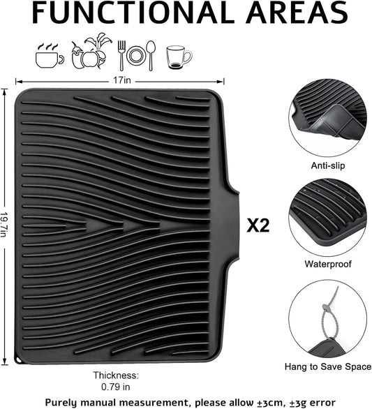 Dish Drying Mat, Stone Drying Mat for Kitchen Counter with Built-in Drain, Non-Slip Drying Matt Kitchen Counter, Heat Resistant Silicone Drying Mat, Dish Drying Pad, 2 Pcs (Black 19.7" x 17")