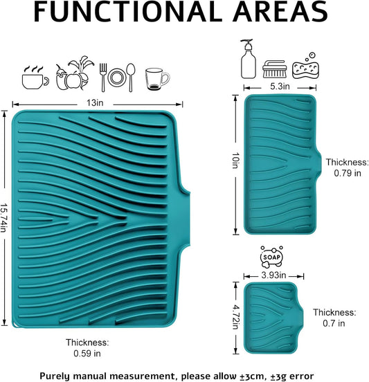 Silicone Dish Drying Mat for Kitchen Counter, Dish Drying Pad, Non-Slip Drain Pad with Built-in Drain, Heat Resistant Stone Drying Mat, 3 pcs (Mint)