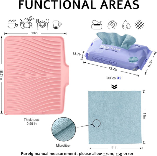 Silicone Dish Drying Mat, Stone Drying Mat for Kitchen Counter with Built-in Drain, Non-Slip 15.8" X 13" Drying Matt Kitchen Counter and Grey Microfiber Cleaning Cloth, Cleaning Rags Set(Pink)