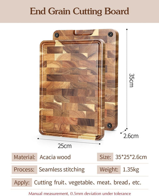 XINZUO Acacia Wood End Grain Cutting Board (13.8''L x 9.8''W x 1''T)-Wooden Chopping Board with Non-Slip Feet, Side Handles and Juice Groove