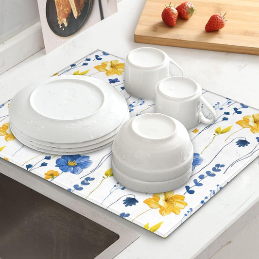 Watercolor Floral Decorative Microfiber Dish Drying Mat for Kitchen Counter 18"x24" Navy Blue Yellow Flower Dishes Pad Dish Drainer Rack Mats Absorbent Washable Reusable