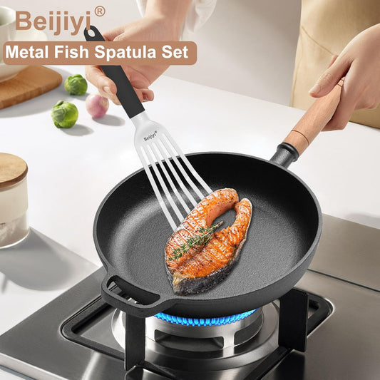 Beijiyi Fish Spatula Stainless Steel, 13.5" Large Metal Fish Spatula for Cast Iron Skillet Cooking and Grilling, Kitchen Slotted Turner with Full Tang Silicone Handle and Curved Blade