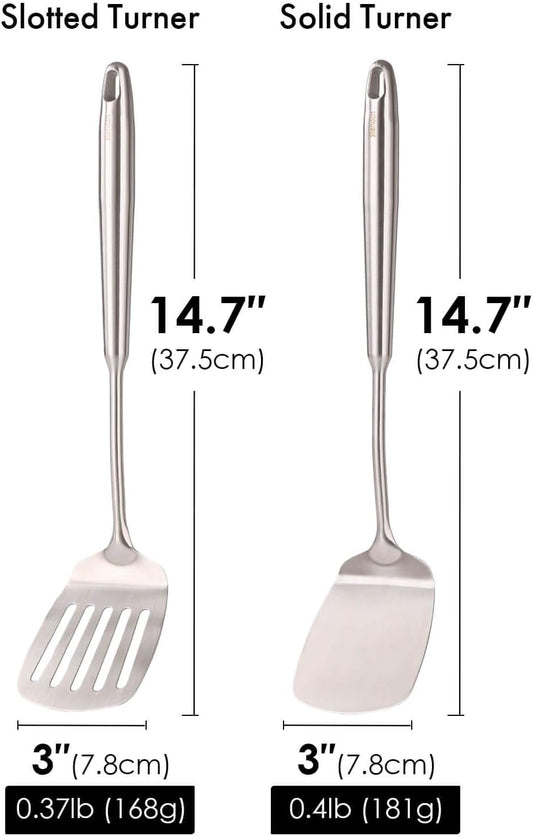 18/10 Stainless Steel Spatulas Set - 15” Long Spatulas for Kitchen, Metal Cooking Utensils - 1 Slotted Spatula + 1 Solid Turner (style A - all metal brushed)