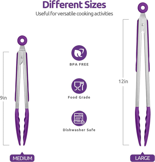 600ºF Heat Resistant Kitchen Tongs: U-Taste 9+12 inch Silicone Cooking Tong Set with Firm Sealed Non Stick Rubber Tips and Silicon Coated 18/8 Stainless Steel Handle for Serving Grilling Salad(Purple)