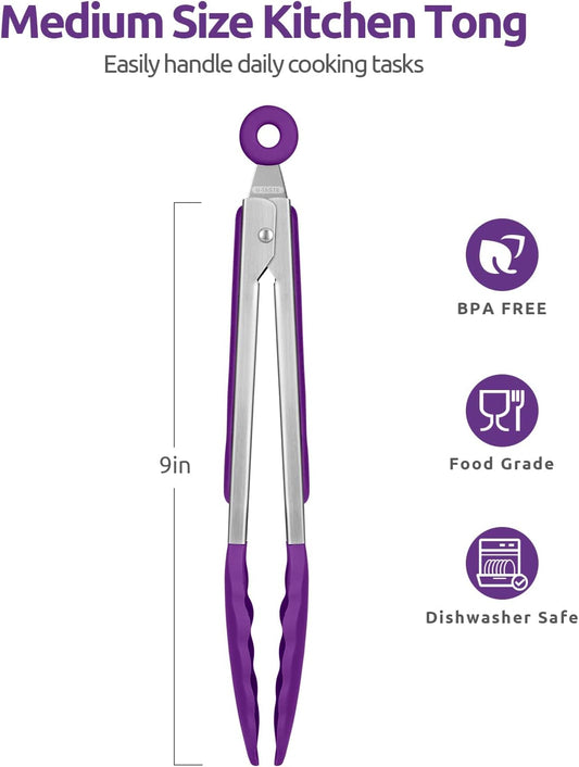 600ºF Heat Resistant Kitchen Tongs: U-Taste 9 inch Silicone Cooking Tong with Firm Sealed Non Stick Rubber Tips & Silicon Coated 18/8 Stainless Steel Handle & Smooth Locking for Serving Grill (Purple)