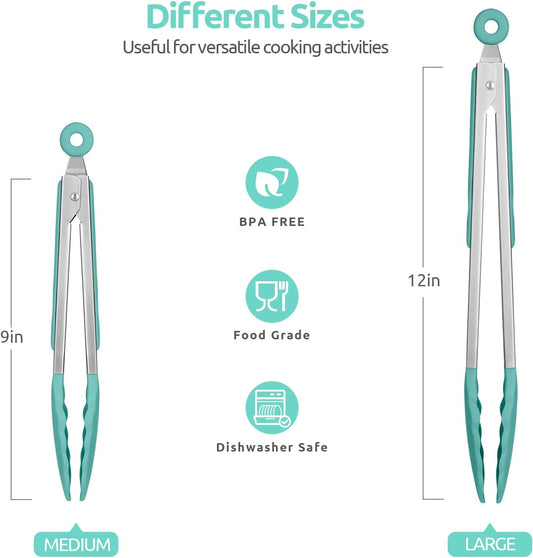 600ºF Heat Resistant Kitchen Tongs: U-Taste 9+12 inch Silicone Cooking Tong Set with Firm Sealed Non Stick Rubber Tips and Silicon Coated 18/8 Stainless Steel Handle for Serving Grilling (Aqua Sky)