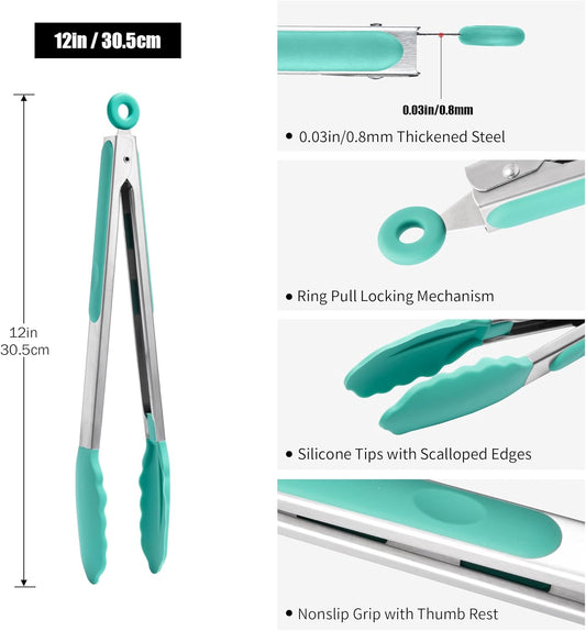Doosu Kitchen Tongs for Cooking - 600°F Heat Resistant Food Tong with Non-Scratch Silicone Tips, Heavy Duty Stainless Steel Locking Tong for BBQ, Grilling Steak, Serving Salad, Pasta (12in, Aqua Sky)