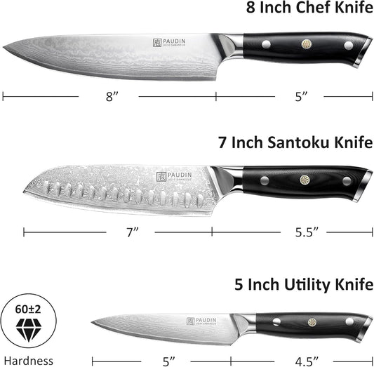 PAUDIN Damascus Knife Set 3 PCS, Japanese VG10 Steel Core, Ultra Sharp Chef Knife Set, Full Tang G10 Handle, Damascus Kitchen Knives