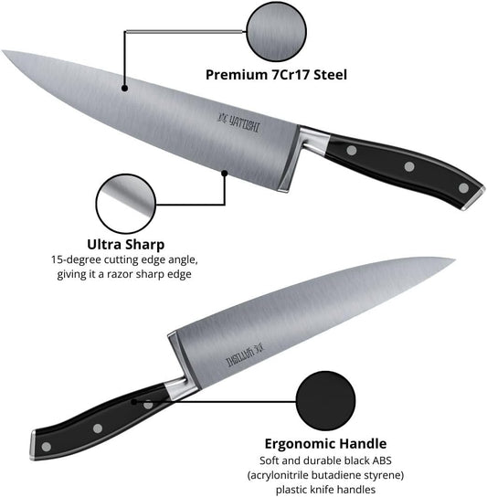 8 Inch Chef Knife, Kitchen Knife with Sharpener and Finger Guard, Professional Steel Sharp Chef's Knife Set with Ergonomic Handle, Gifts for Mom/Dad, Black