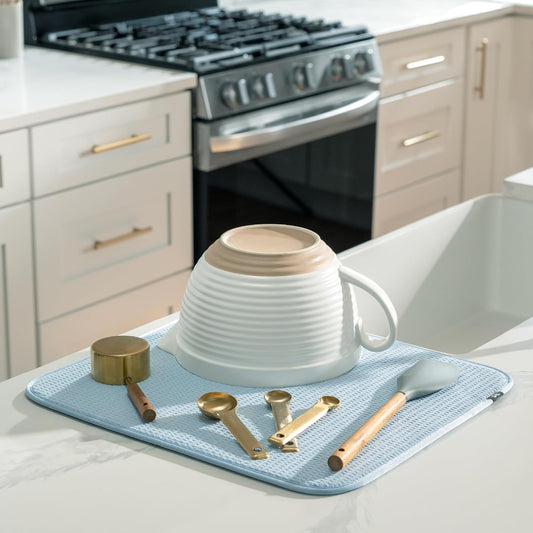 S&T INC. Dish Drying Mat, 16” x 18”, Absorbent Microfiber Kitchen Counter Mat, Dish Drying Pad for Dishes, Utensils, Pots and Pans, Large, Sky Blue