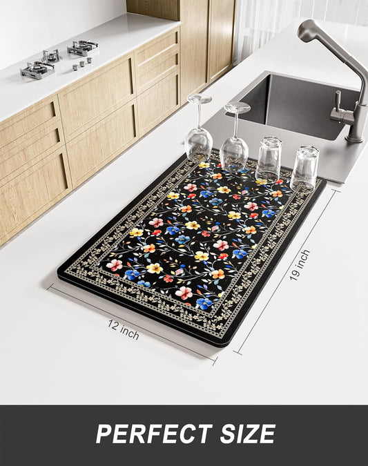 Rnivvi Dish Drying Mat for Kitchen Counter, 12 x 19" Cute Flower Theme Super Absorbent Draining Pad, Non-Slip Heat Resistant Coffee Bar Mat for Coffee Machine Station Accessories, Retro Dish Rack Pad