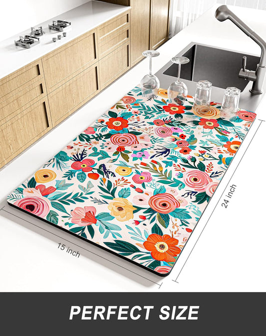 Rnivvi Dish Drying Mat for Kitchen Counter, XL 15 x 24" Cute Flower Super Absorbent Draining Pad, Non-Slip Heat Resistant Coffee Bar Mats for Coffee Machine Station Accessories, Colorful Dish Rack Pad