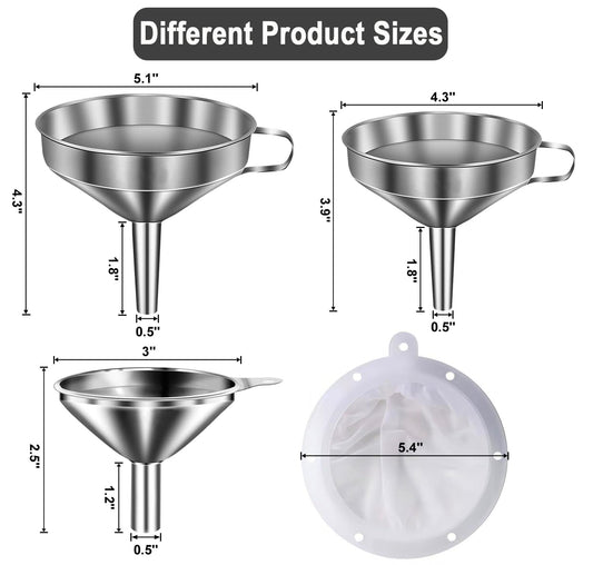 Stainless Steel Funnels for Kitchen use,4PCS Kitchen Metal Funnel with 2 Removable Strainer,Cleaning Brush.Funnel for Filling Bottles,for Transferring of Liquid,Oils,Jam (5.1",3",2.2",1.8")