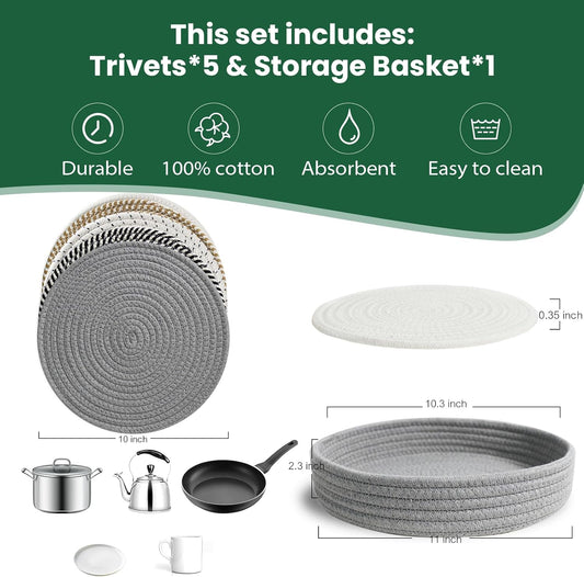 RIOOP 10 Inches Trivets for Hot Dishes, Pots and Pans with Storage Basket, 5 Heat Resistant Large Coaster for Kitchen, Hot Pads Mats for Countertops Table Kitchen Essentials Farmhouse Halloween Decor
