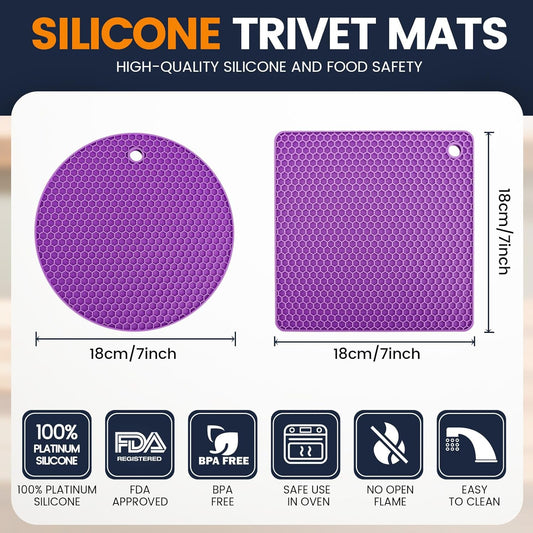 Silicone Trivet Mats 4 Heat Resistant Pot Holders Multipurpose Non-Slip Hot Pads for Kitchen Potholders, Drying mat, Jar Opener, Spoon Holder, Coaster(Violet)