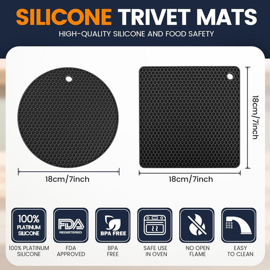 Silicone Trivet Mats 4 Heat Resistant Pot Holders Multipurpose Non-Slip Hot Pads for Kitchen Potholders, Drying mat, Jar Opener, Spoon Holder, Coaster(Black)