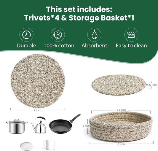 RIOOP 7 Inches Trivets for Hot Dishes, Pots and Pans with Storage Basket, 4 Heat Resistant Large Coaster for Kitchen, Hot Pads Mats for Countertops Table Kitchen Essentials Farmhouse Halloween Decor
