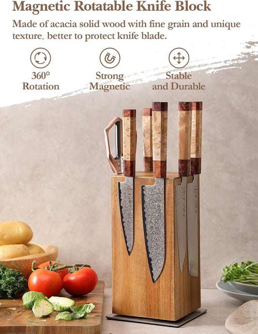 HEZHEN Magnetic Rotating Knife Holder without Knives, Acacia Wood, 360° Knife Block for Kitchen Counter, Space-saving and Larger Capacity Knife Storage, Strong Enhanced Magnets Strip