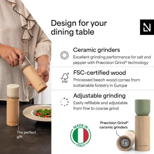 LARS NYSØM Wooden Salt and Pepper Grinder Set Manual - Salt and Pepper Mills with Adjustable Ceramic Grinder - Elegant Beechwood Pepper and Salt Mill Set for Dining Table (Green/Beige)