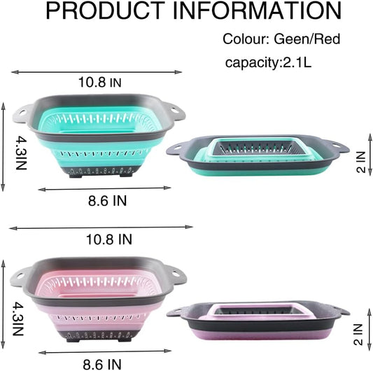 Collapsible Colander Set, Square Round Triangles Silicone Kitchen Strainer Perfect for Draining Pasta Vegetable fruit 2 PCS (Green & Red, 12"L x 9.5"W x 2.3"H)