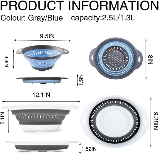 Collapsible Colander Set, Square Round Triangles Silicone Kitchen Strainer Perfect for Draining Pasta Vegetable fruit 2 PCS (Gray&Blue, 12"L x 9.5"W x 2.3"H)
